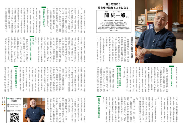 協力隊の体験、マザーテレサ、鍼灸、師匠そして患者さんやセラピーとの出会い、この全てが「自分を知る」ことの意味や大切さを教えてくれた。それを数十年かけてアタマから腑に落とし続けていると感じている。
